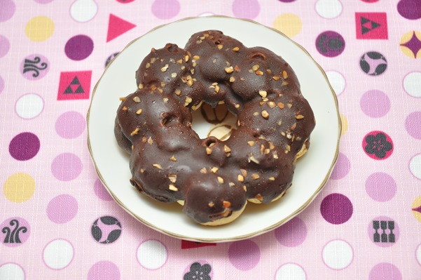 シュークリームを円盤状にして、その中にクリームを入れて、上にチョコとアーモンドを乗っけたデザート。